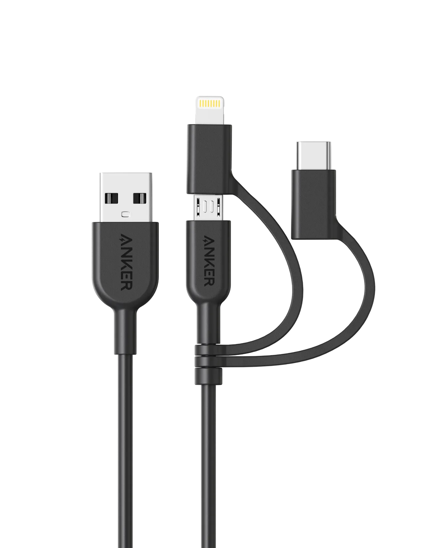 كابل أنكر PowerLine II 3 في 1 بطول 3ft، مزود بمنافذ USB Micro وUSB-C وUSB Lightning، لتوصيل وشحن مختلف الأجهزة بسهولة وفعالية.